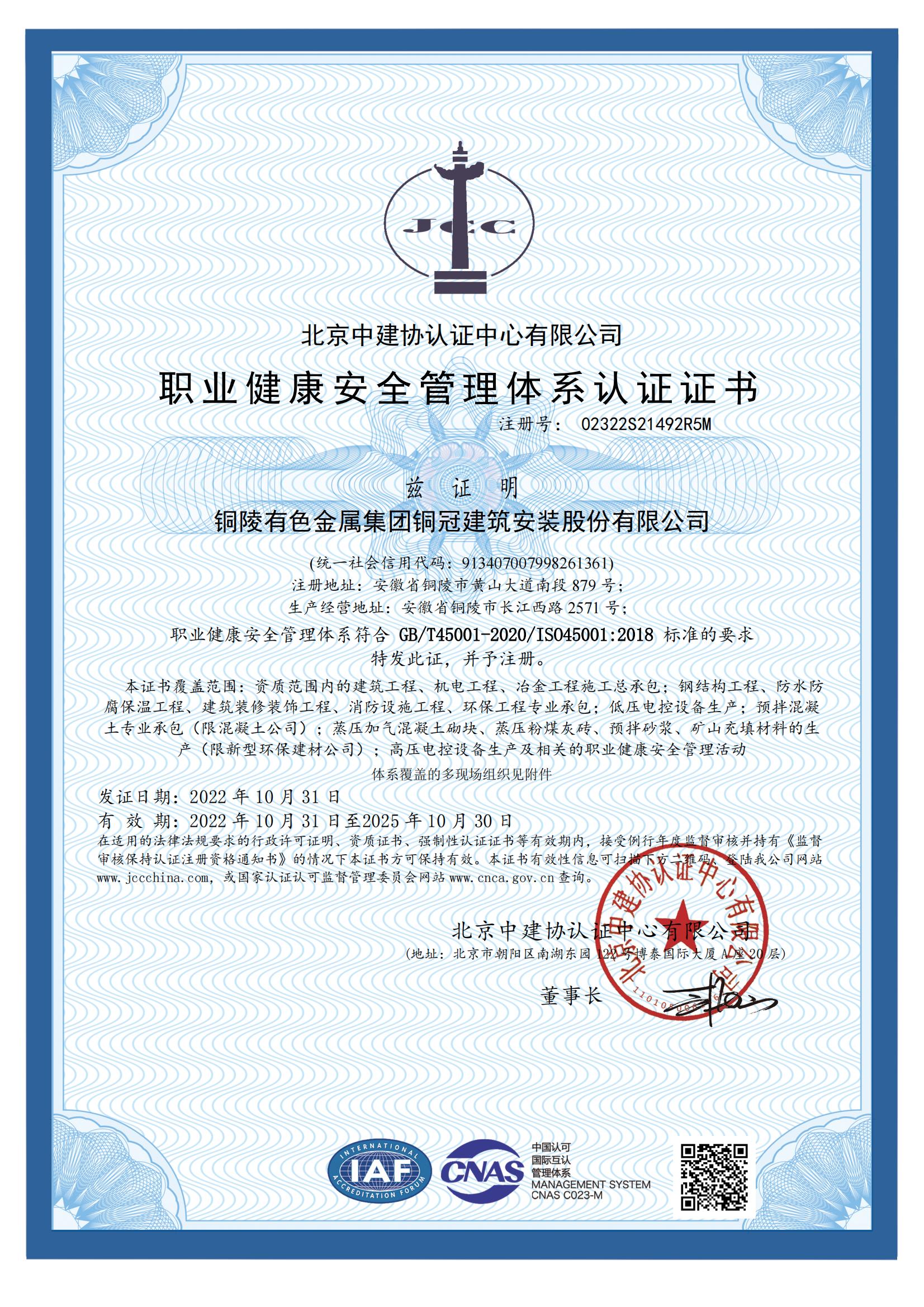 职业健康安全管理体系认证证书